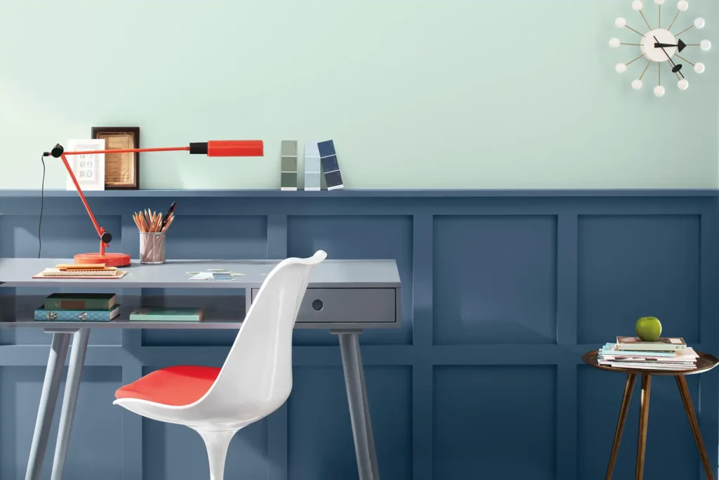 Styling Tip: Use Palladian Blue with light wood tones, woven textures, and minimalist décor to create a serene yet stylish home office.